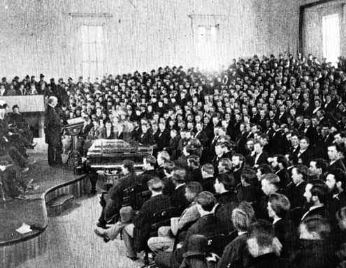 Thursday Noon Live In the early days of Oberlin College, students worshipped every day. President Fairchild led this service about 1885.