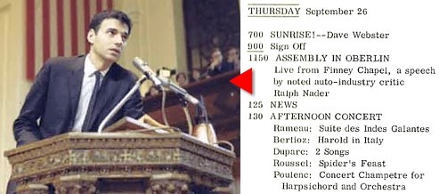 WOBC often interviewed the newsworthy guest speaker for that night's OBERLIN DIGEST. When I became Station Director, we decided it would also be a good idea to broadcast the actual speeches live, for the benefit of the absent half of the student body as well as everyone else in town. We reckoned this would be a simple remote. A telephone line was available to transmit the signal 500 feet west to our studio in the next building, so we merely needed to add the audio to that, ahem, Assembly line.