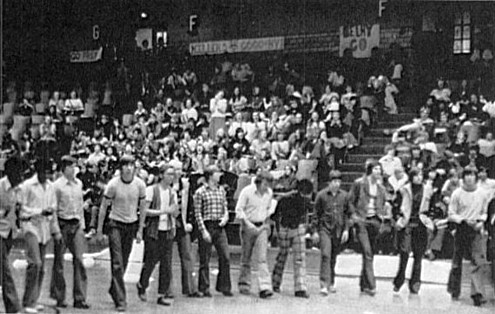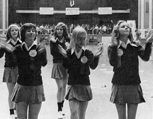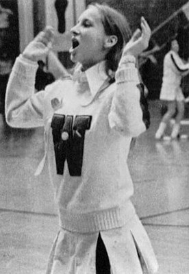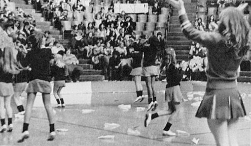 The cheerleaders duties included stirring up school spirit before each big game. Sometimes, a period during the school day was set aside for them to hold a pep rally in the gymnasium. Because the gym also served as the schools auditorium, it had a stage in one end zone, and on that stage sat the band.
