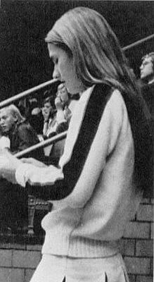 One of the cheerleaders was to be his victim. To protect her hair, she put on a shower cap. To protect her sweater, she donned some sort of a plastic bib.