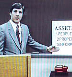 Monday, September 28, 1987 The first segment of the show was still not quite as fast-paced as an Evening Magazine first segment, but it's getting there. I remain reluctant to limit George to less than 30 seconds of analysis at the top of the show. But I think we can get him some more time (on afternoon games, at least) by having him join John Sanders for some of the leads to quarters, when there are relevant points to be made. George was very uncomfortable doing his commentary. Tom Huet worked with him on it in Boston before the game. After the game, when it was time to tape the commentary, they tried several takes in which George looked alternately at his notes and the camera. He'd get partway through it, then get hung up. Then they tried a couple of takes in which George spoke from memory directly to the camera. He looked much more natural, but he still couldn't get through it. We were eating up satellite time rapidly. Finally they got him all the way through the commentary by having him put on his glasses and read it, without bothering much about looking at the camera. One of the difficulties was that the subject of the commentary was ambitious. As a result, the text was too long; it took 2:22 to deliver. Not only did this halt the show's pace, but it also made it that much harder for George to get all the way through a take. If he would tackle a smaller subject and make just one point about it, he could keep his text to under a minute. Then he might be able to deliver it from memory or even extemporaneously.