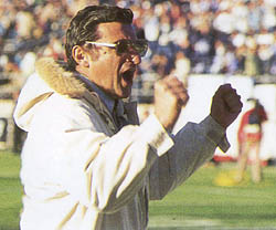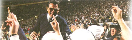 In 1986, as a television producer for Penn State Football, I had on tape a few short sound bites from Sue Paterno. They weren't much, but I wanted to turn them into a four-minute video tribute to her husband. So I laid them over the instrumental sections of the 1985 Stevie Nicks song "Has Anyone Ever Written Anything For You" (excerpted below). During the vocal sections, I used a video montage of the coach. I since have read, in the notes for Stevie's "best of" album TimeSpace, her own account of this song. She writes movingly of another man called Joe, a little daughter that he had lost, and a two-hour Jeep ride leading to a child-sized fountain in a snowy Colorado park. But because of the ambiguity of poetry, a different meaning emerged when I used this song in my video, and the words seemed to be those of Sue Paterno to her Joe. "In all your darkest hours" alluded not to death but to losses on the football field. I illustrated "And the rain comes down" rather literally with scenes of a particularly disappointing rain-soaked game in Florida, after which the tide turned, climaxing with the triumph of a national championship: "I believed in you every day. If not for me, then do it for the world!"