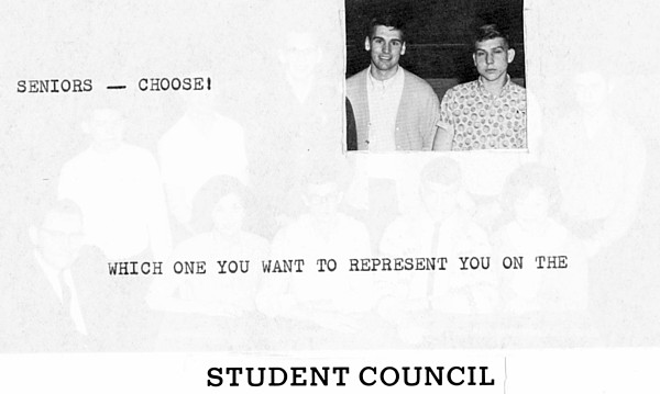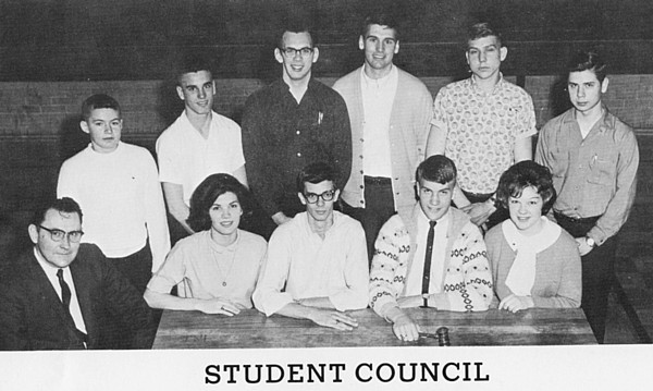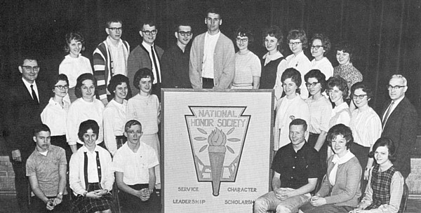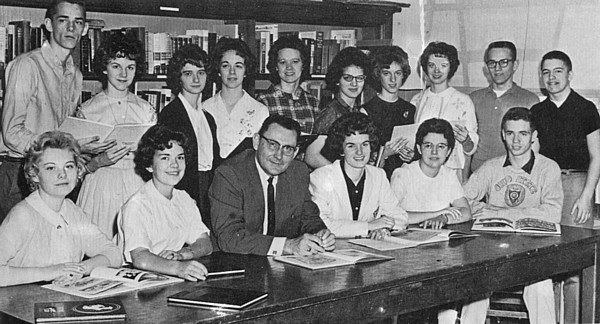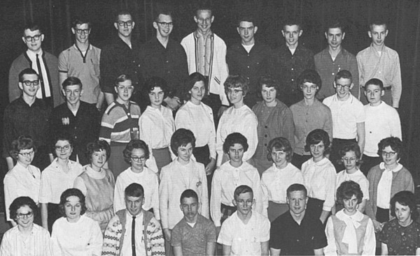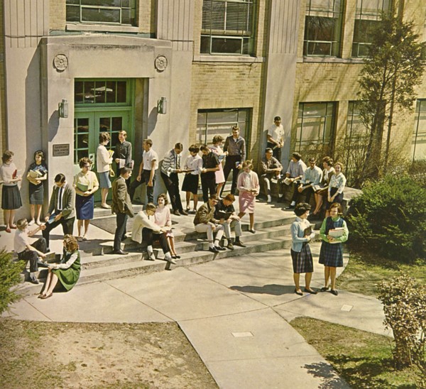 members of the Richwood High School Class of 1964 pose at the main entrance.
