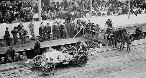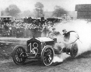 Notice the wire suspended above the chalked starting line. Car #10, the Darracq driven by Louis Wagner, would ultimately be the winner. Here is some film footage of the event.