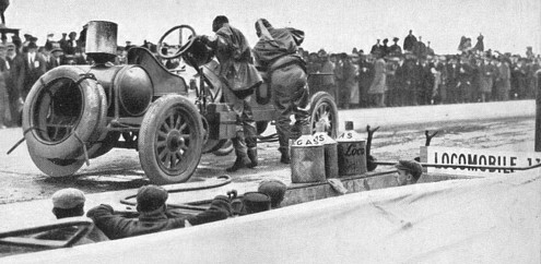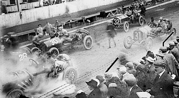 Besides the paved sections, another innovation that year was the pit stop, copied from the French Grand Prix held three months before. Heretofore the various competing manufacturers had "made camp" in fields at points scattered around the course, where their cars would stop for service as needed. Flat tires were common in those days, so there were also half a dozen Diamond Tire Controls.