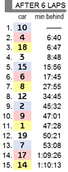 It was an angled two-sided scoreboard. Nowadays we're used to leader boards on which the rows represent running positions, as I've simulated on the right below using the actual Vanderbilt times, but in 1906 each horizontal row represented a car.