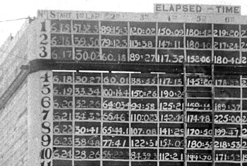 The vertical columns represented the laps, of which there were only ten. Near the top was a horizontal rail, upon which slid a ladder at least 20 feet tall. As each car completed a lap, the time was noted, and somebody climbed up to add the elapsed minutes and seconds to the display.