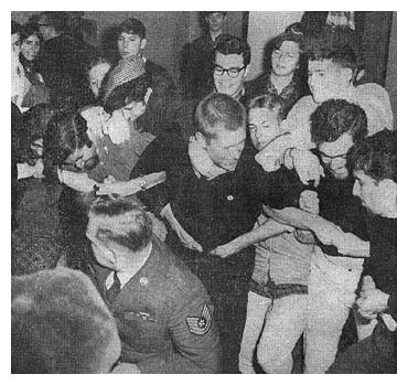 Jan Olson came up with one of the best comments I've heard lately on this fight-for-progress thing. She was remembering the last night of Freshman Orientation, when the president of Student Council (as it was called then) was addressing us freshmen about the goals of the Council the usual sort of thing, liberalized social rules mainly. "We're going to put all we've got into getting these proposals passed!" he was saying. Jan said, "Now I didn't quite know what he was talking about. And besides, I had picked Oberlin as the college of my choice out of all the colleges in the country because I liked it the way it was. Here he was saying we've got to make all these changes!" It does cause a little resentment among those of us who are satisfied with the present situation when these wild-eyed longhairs start trying to turn Oberlin into something else. But I guess progress is inevitable.